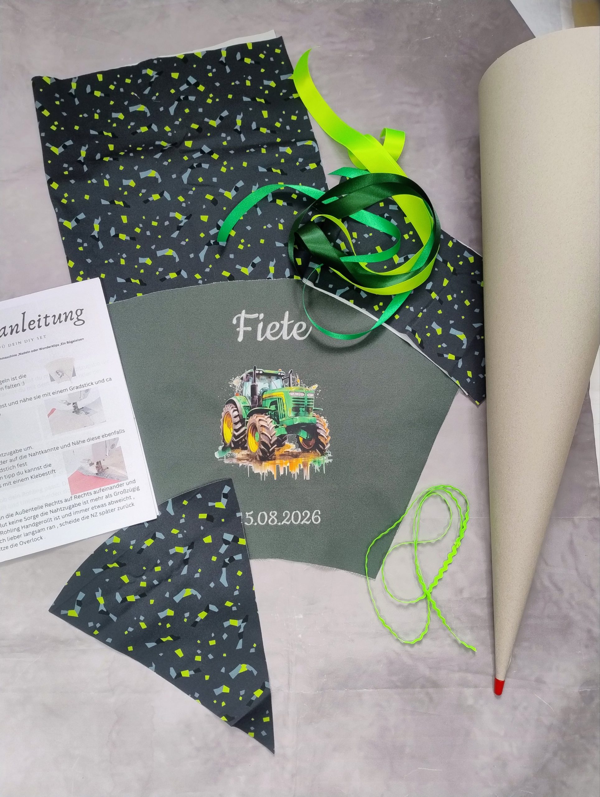 Mit diesem liebevoll zusammengestellten Nähset für die Schultüte „Bagger Rocco“ kannst du eine ganz besondere Schultüte selbst nähen. Farblich abgestimmt auf den passenden Schulranzen und mit einem starken Traktor-DTF-Druck auf dem Mittelstück ist das Design perfekt für kleine Baustellen- und Fahrzeugfans.