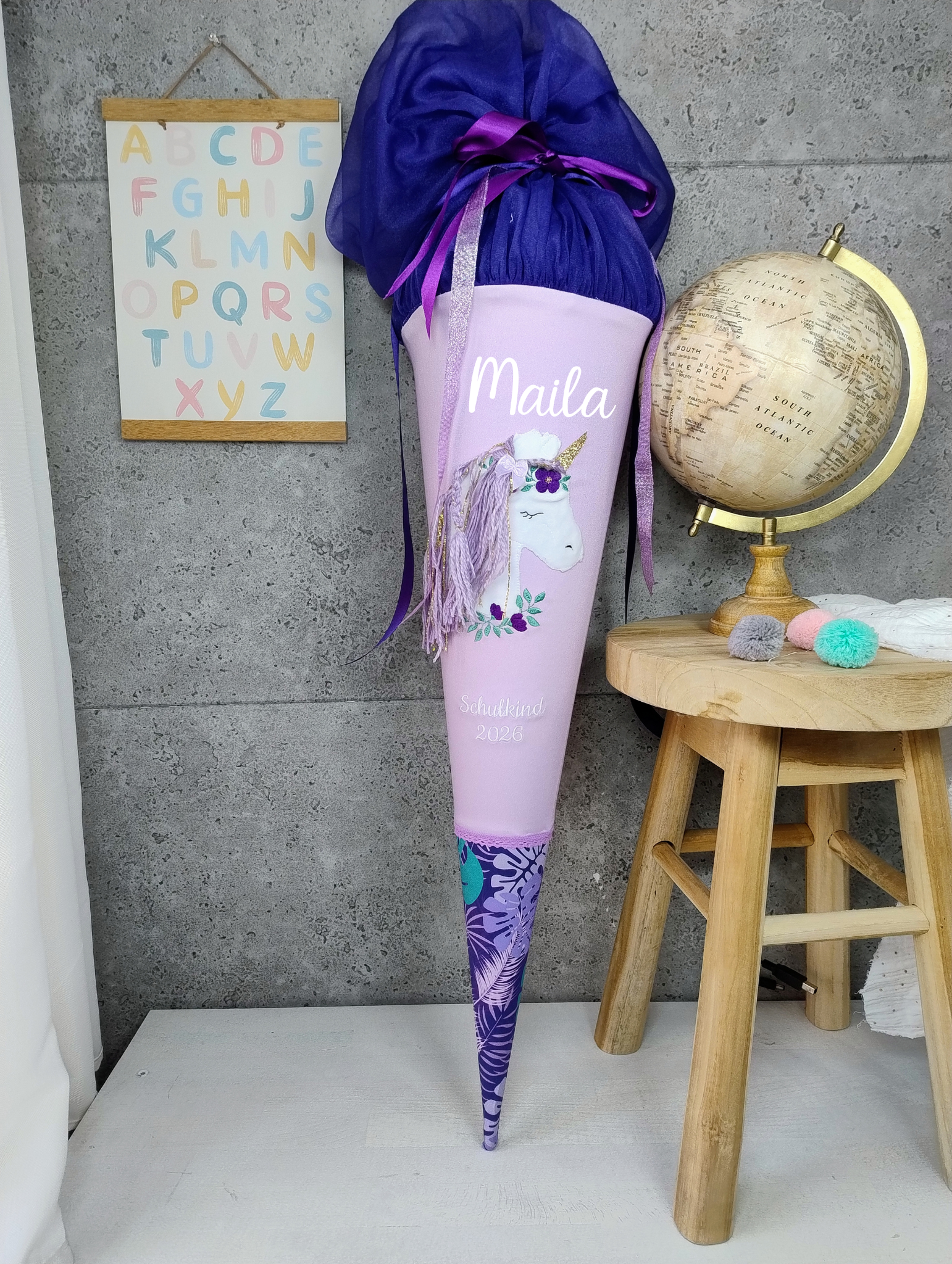 Schultüte Lila mit Einhorn und 3d Mähne mit Tüll auf wunsch mit Namen Einzelstück