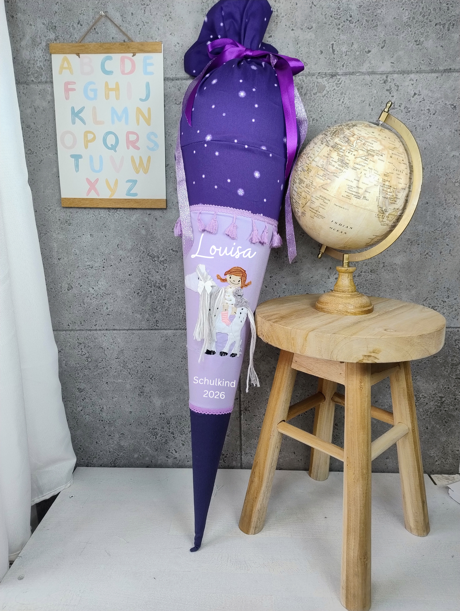 Schultüte Lila mit Fransen Pferd und Mädchen auf wunsch mit Namen Einzelstück (Kopie)