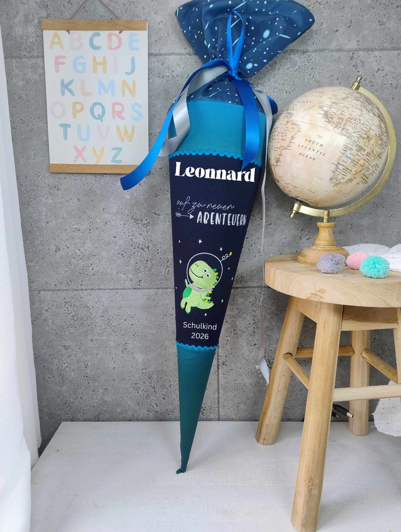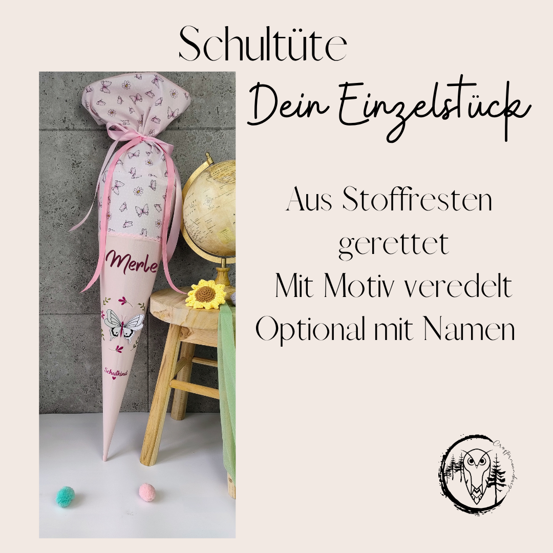 Die Schultüte besteht aus Stoff und wird auf Wunsch mit dem Namen deines Kindes beplottet, wahlweise auch mit dem Schriftzug „Schulkind 20XY“.