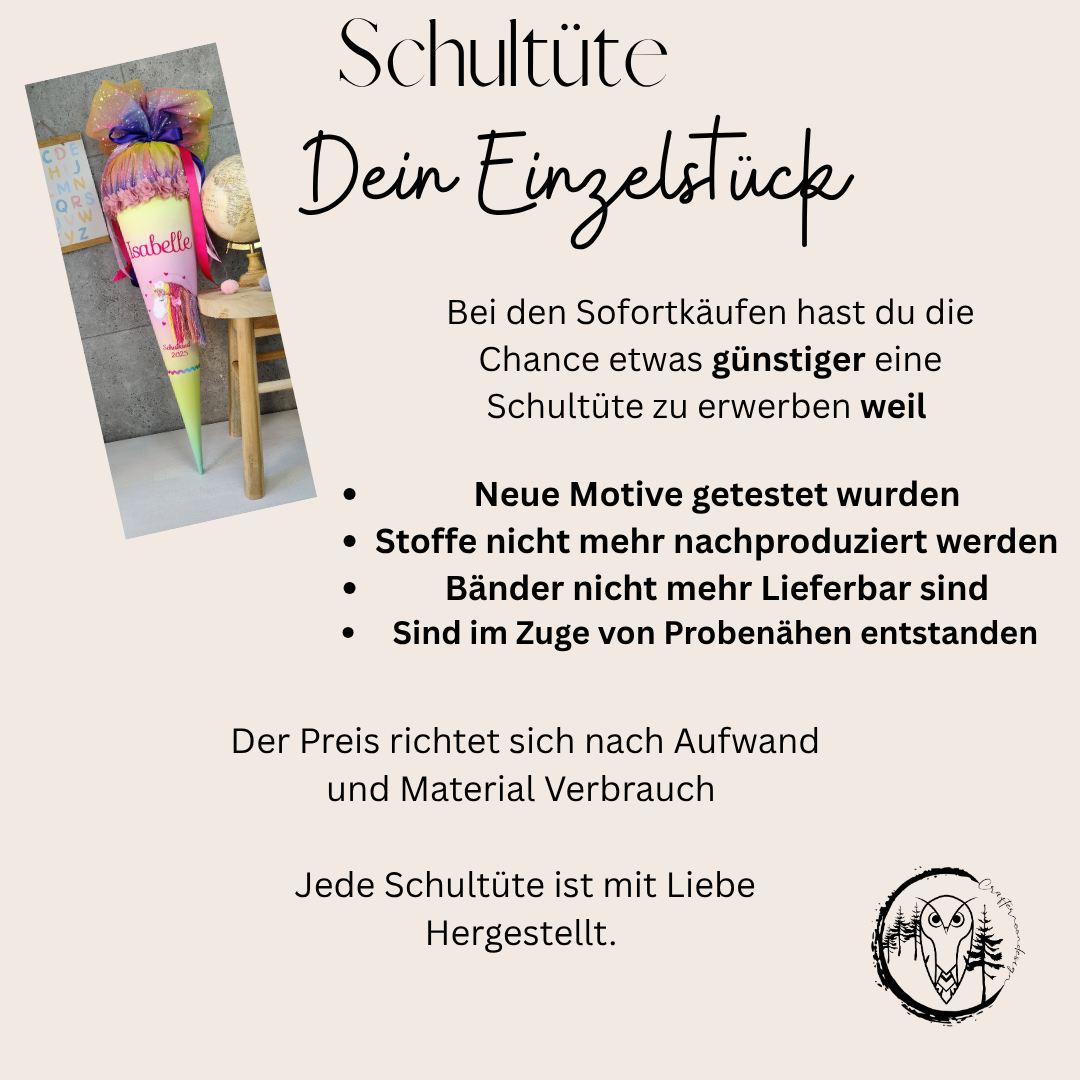 Einige meiner Produkte enthalten Kleinteile wie Glitzersteine, Perlen oder Pailletten, die für kleine Kinder eine Erstickungsgefahr darstellen können. Achten Sie darauf, dass insbesondere Kleinkinder nicht ohne Aufsicht mit diesen Materialien hantieren. Die Schultüte ist ausschließlich für besondere Anlässe und Feierlichkeiten konzipiert und sollte nicht als Spielzeug verwendet werden. Wenn sie später aufbewahrt wird, eignet sie sich nur als dekoratives Element. Obwohl bei der Auswahl der Materialien auf ökologische Verträglichkeit geachtet wird, besteht die Möglichkeit, dass einzelne Bestandteile allergische Reaktionen hervorrufen können. Für Schäden, die durch unsachgemäßen Gebrauch entstehen, wird keine Haftung übernommen. Es liegt in der Verantwortung der Erziehungsberechtigten, Risiken wie Strangulation, Verschlucken oder Ersticken durch angemessene Aufsicht zu verhindern.