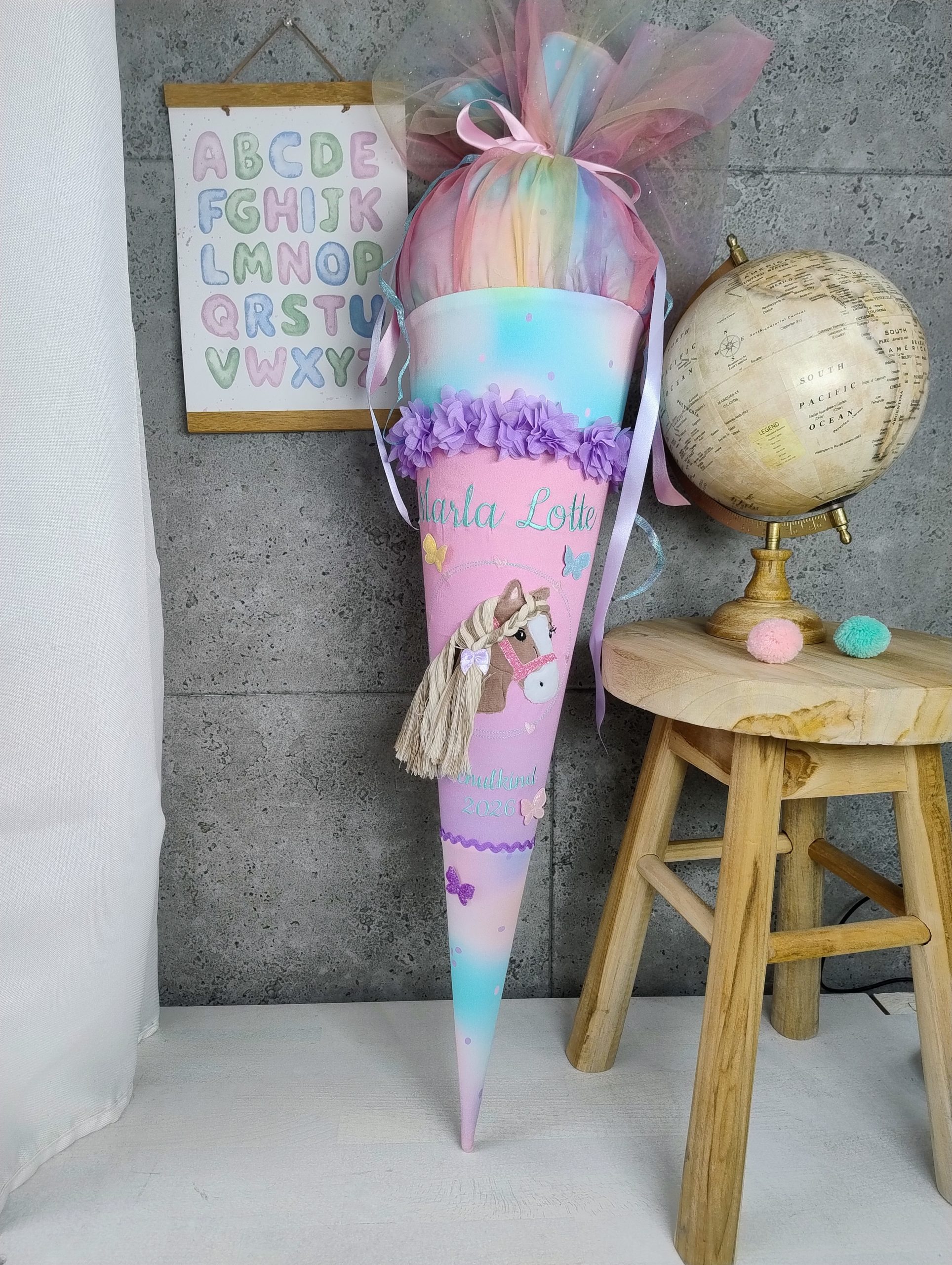Diese besondere Schultüte passt perfekt zum Step by Step Schulranzen „Butterfly Luna“ und wird von mir mit viel Liebe zum Detail gefertigt. Auf der Vorderseite befindet sich ein gesticktes Pony-Motiv, ergänzt durch einen 3D-Schmetterling mit Glitzerelementen, der der Schultüte eine zauberhafte, lebendige Optik verleiht.