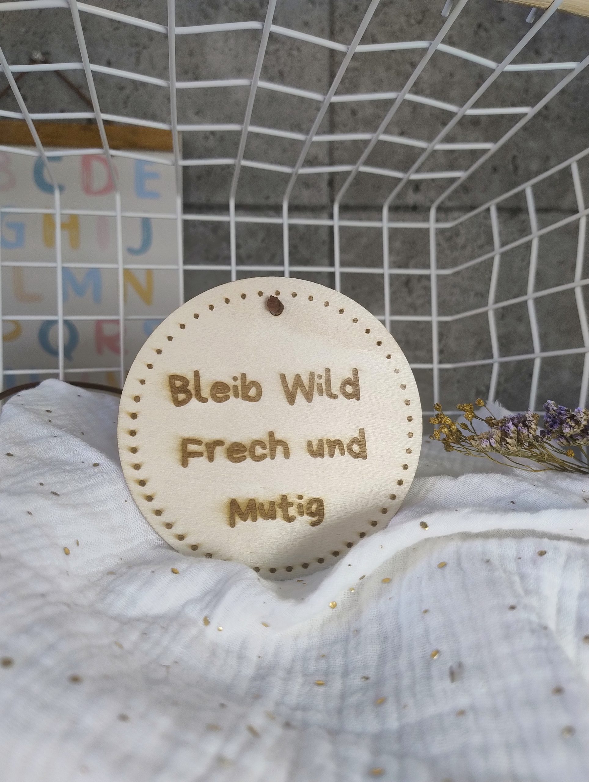 Mit meinem Holzbutton mit dem Spruch „Bleib frech, wild & mutig“ schenkst du deinem Kind Mut, Selbstvertrauen und eine liebevolle Erinnerung für den großen Tag.