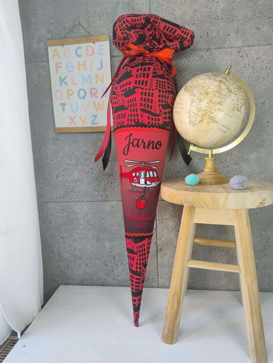 diese besondere Schultüte passend zum Ergobag Ranzen „Alarmbärreitschaft“ – farblich abgestimmt und mit einem auffälligen Hubschrauber-Motiv auf der Vorderseite.